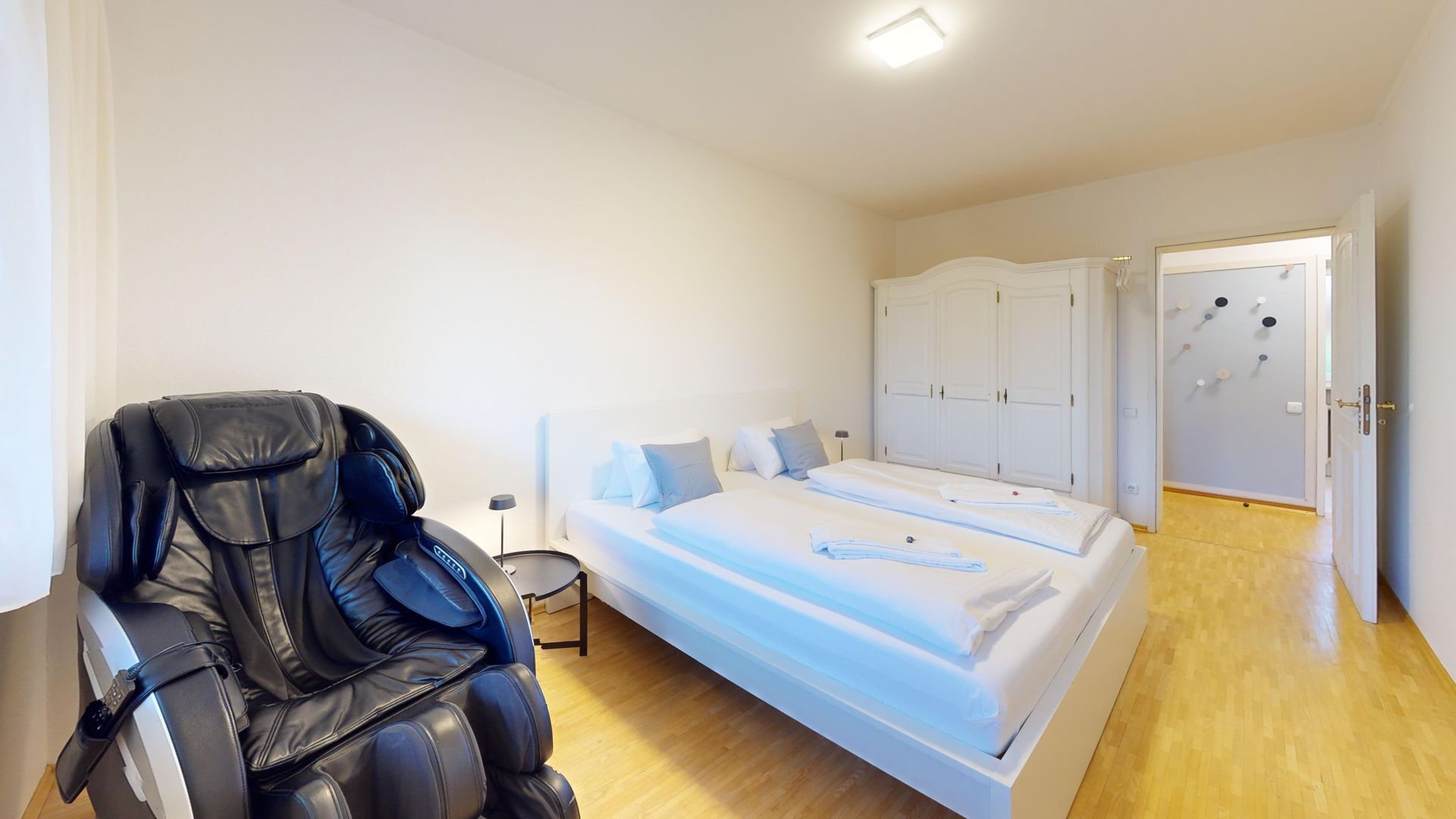 Das separate Schlafzimmer verfügt über ein komfortables Doppelbett (180 cm) und einen luxuriösen Massagesessel – perfekt, um nach einem langen Tag in den Bergen zu entspannen. Im Wohnzimmer sorgt ein gemütlicher Kamin für wohlige Wärme und eine behagliche Atmosphäre. Hier befinden sich ein Einzelbett und ein Schlafsessel, der bei Bedarf zusätzlichen Schlafplatz bietet.