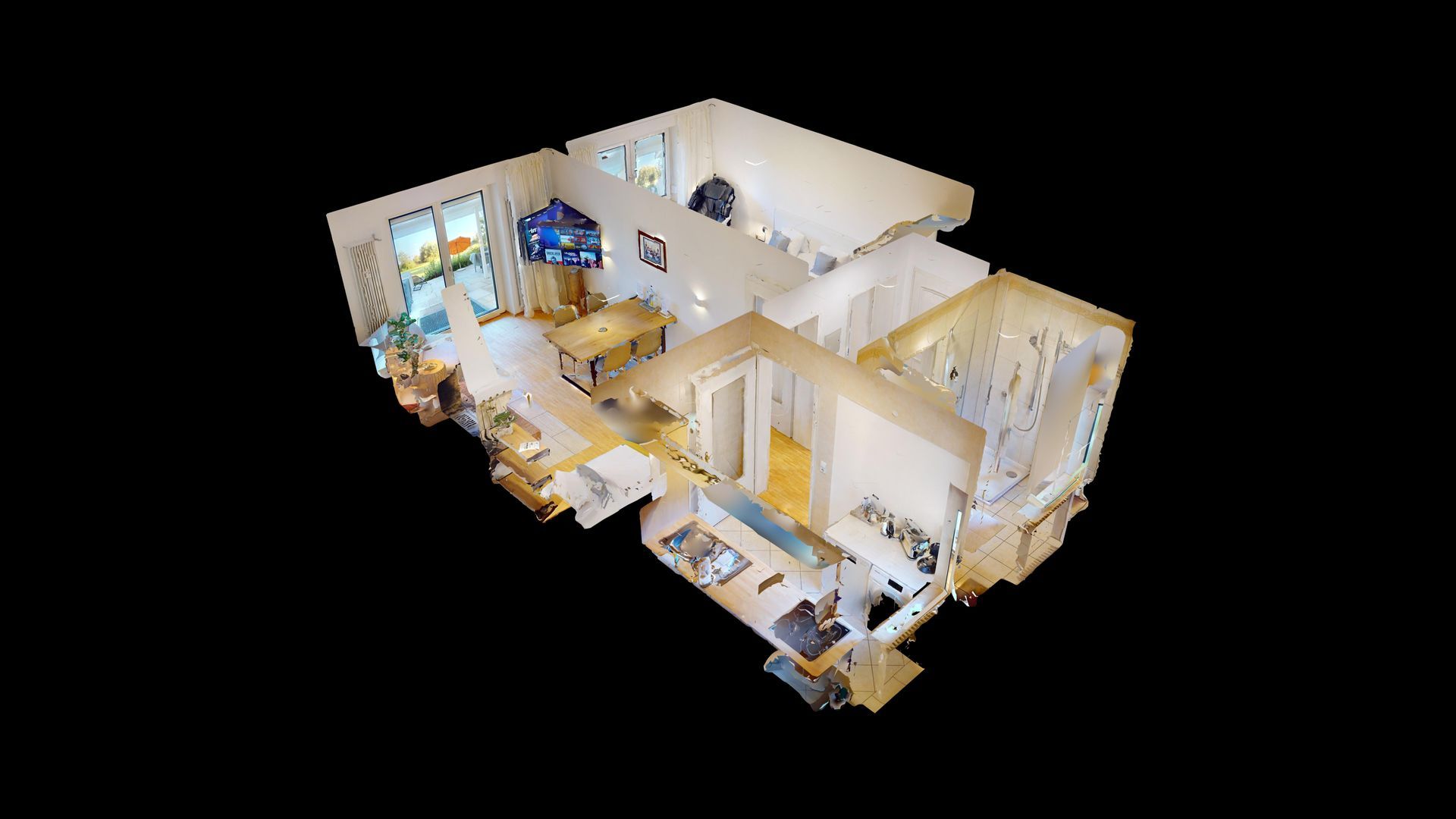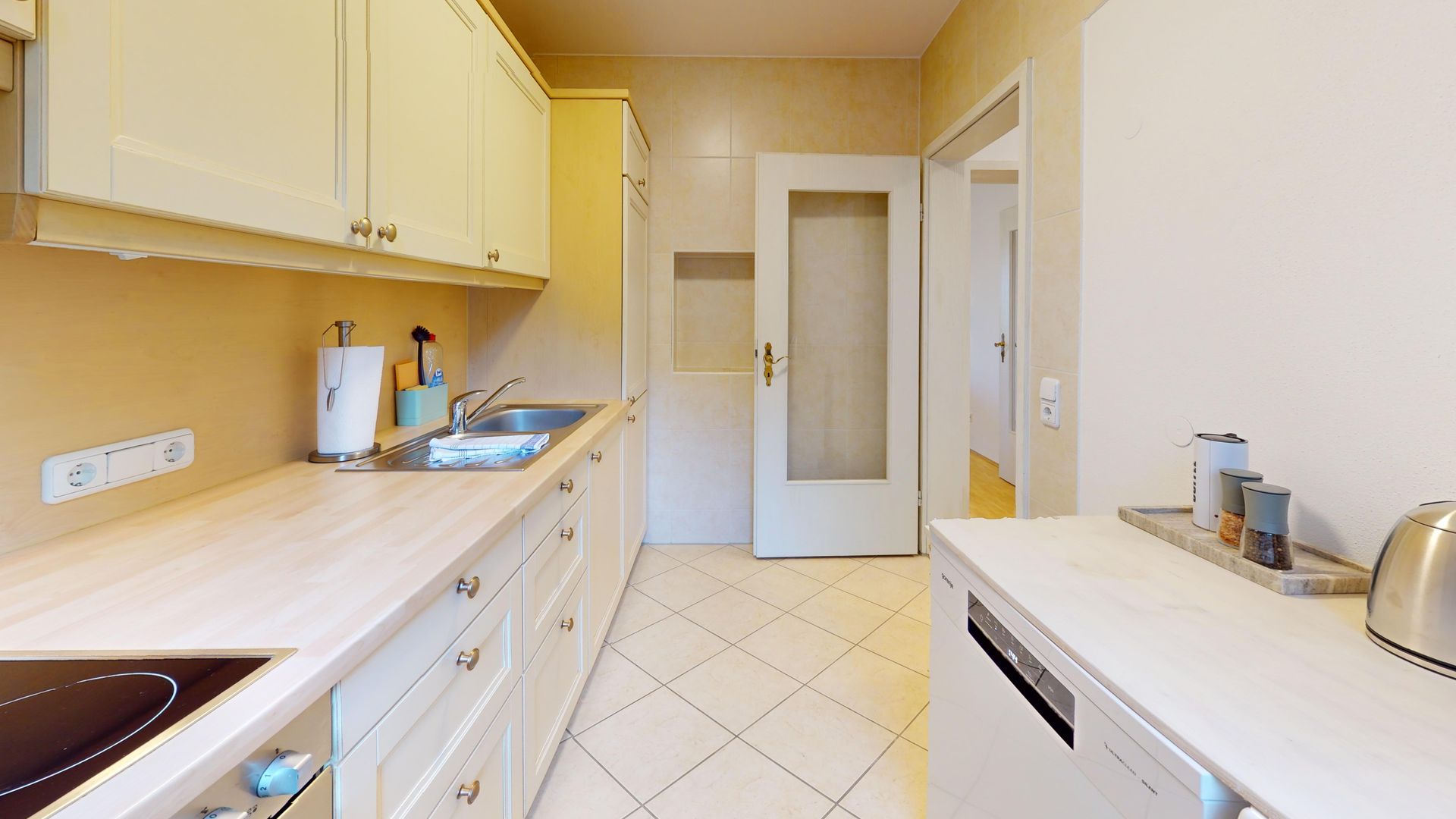Die Küche ist vollständig ausgestattet und lässt keine Wünsche offen: vom Geschirrspüler über Herd und Backofen bis hin zur eigenen Waschmaschine. Das moderne Badezimmer ist mit einer geräumigen Dusche ausgestattet.