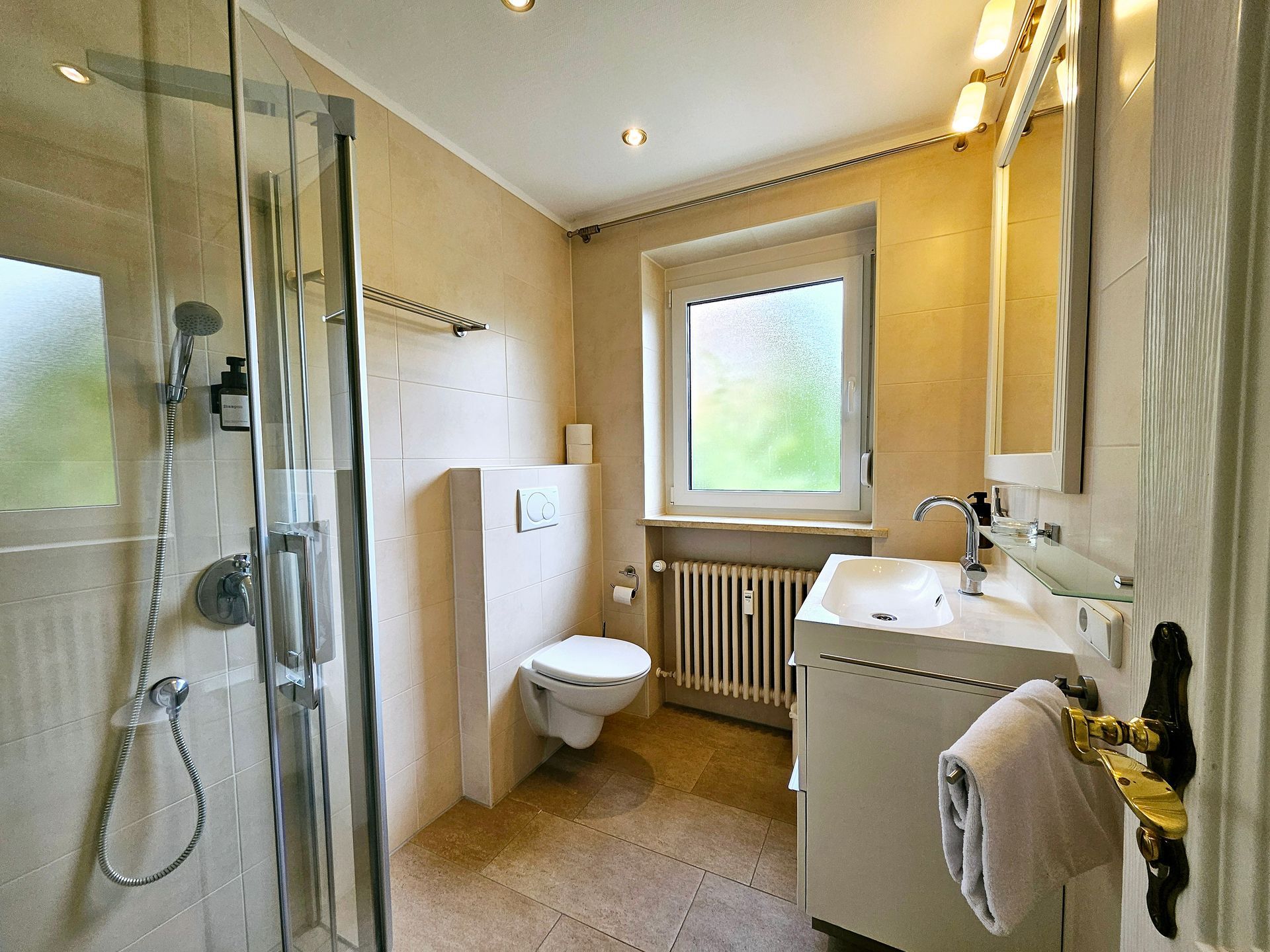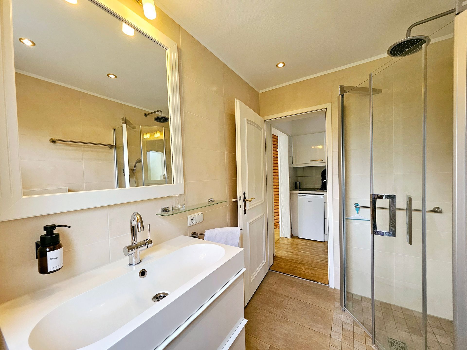Das Apartment verfügt über ein eigenes Bad mit Dusche, damit Du Dich nach einem aktiven Tag in den Bergen erfrischen kannst. Die kleine Küchenzeile bietet das Wichtigste, um einfache Mahlzeiten zuzubereiten, und für Deinen Komfort steht eine Waschmaschine zur gemeinschaftlichen Nutzung zur Verfügung.