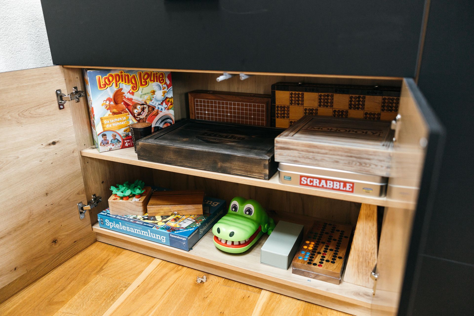 Tisch, 6 Stühle, Kinderstuhl, Tischleuchten, Kommode, Spiele...