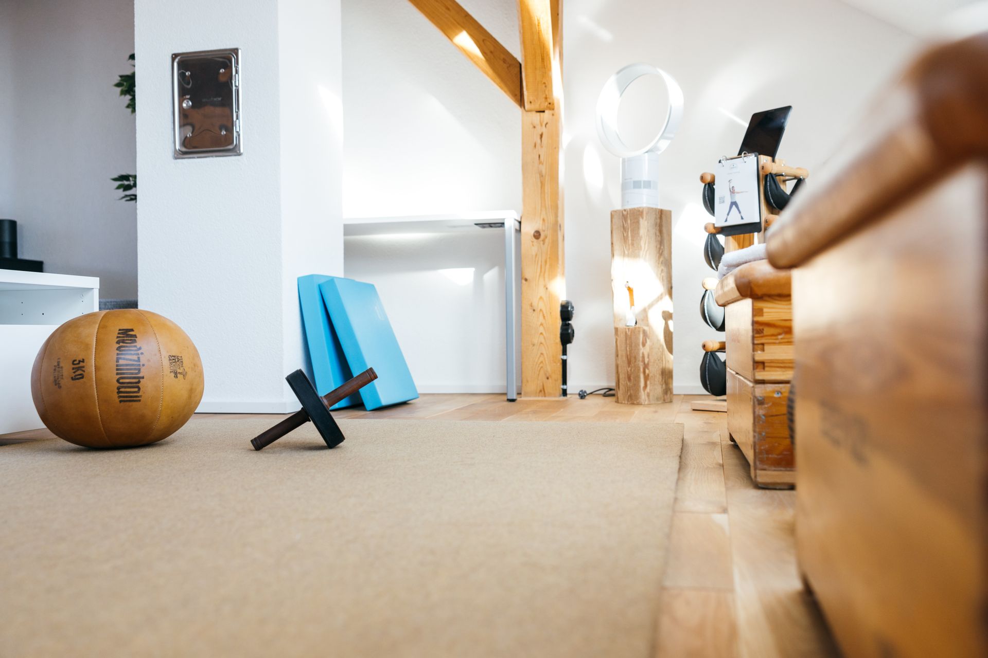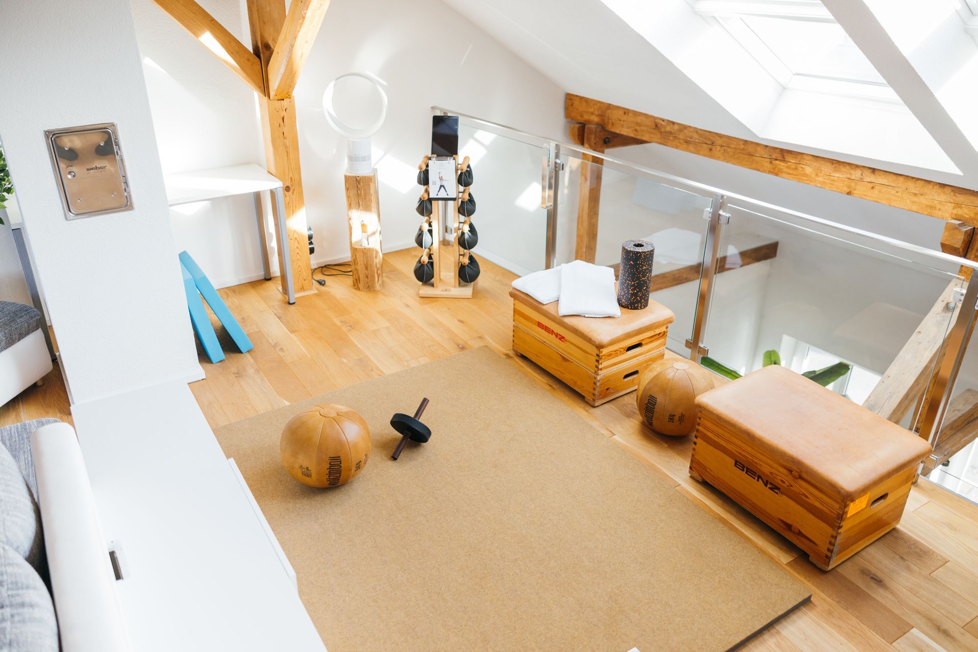 Wohnlandschaft, 75" TV, 2x Schlafsessel (90x200), Beistell- und Couchtische, Bose Smart Speaker, Trainingsmatte 200x150cm, "Nohrd" Design-Hantelständer, diverse Fitnessausstattung