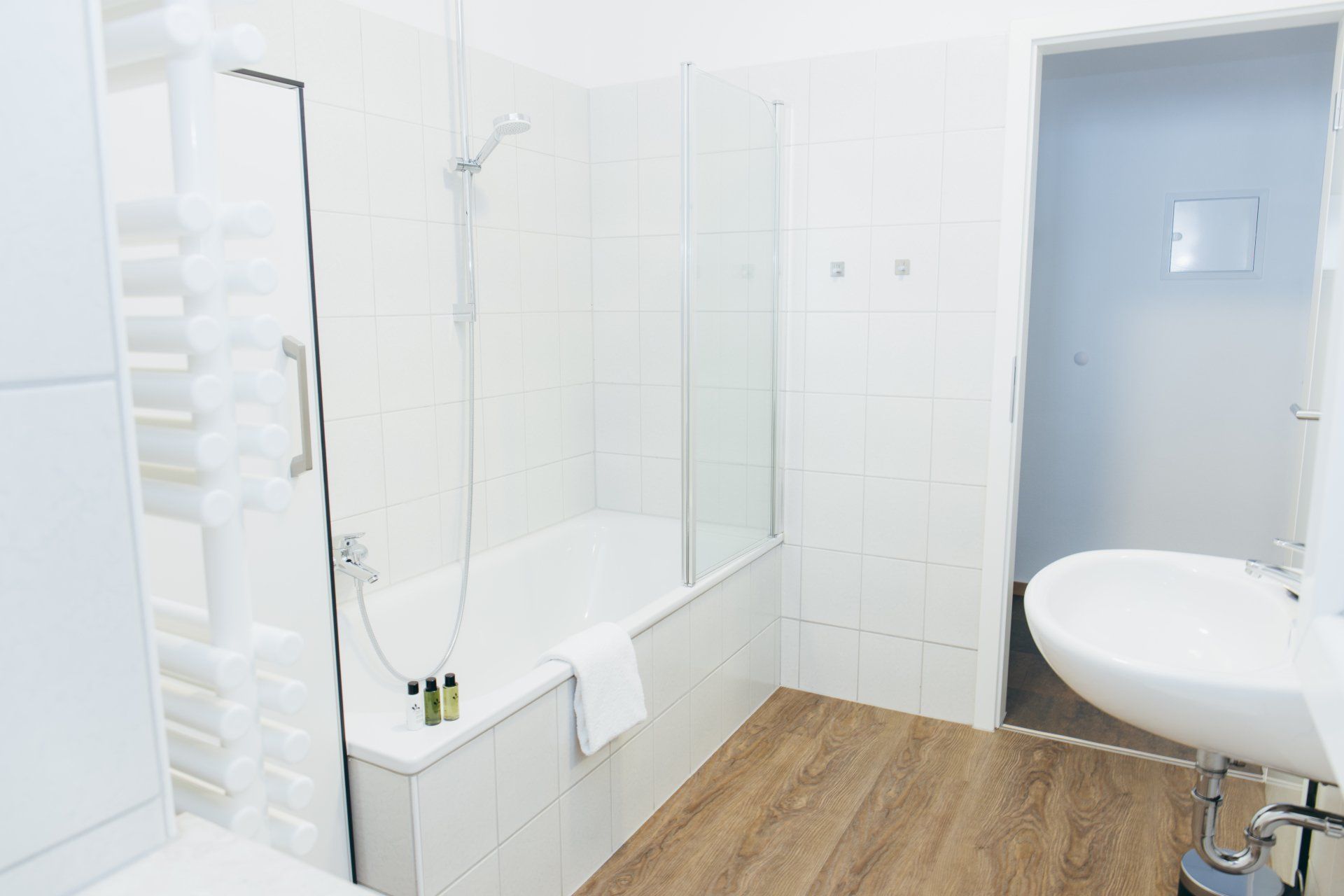 Der Schlafsessel kann auf Wunsch zu einem vollwertigen und komfortablen Bett für eine dritte Person umgebaut werden. Das Badezimmer ist mit einer Badewanne ausgestattet.
