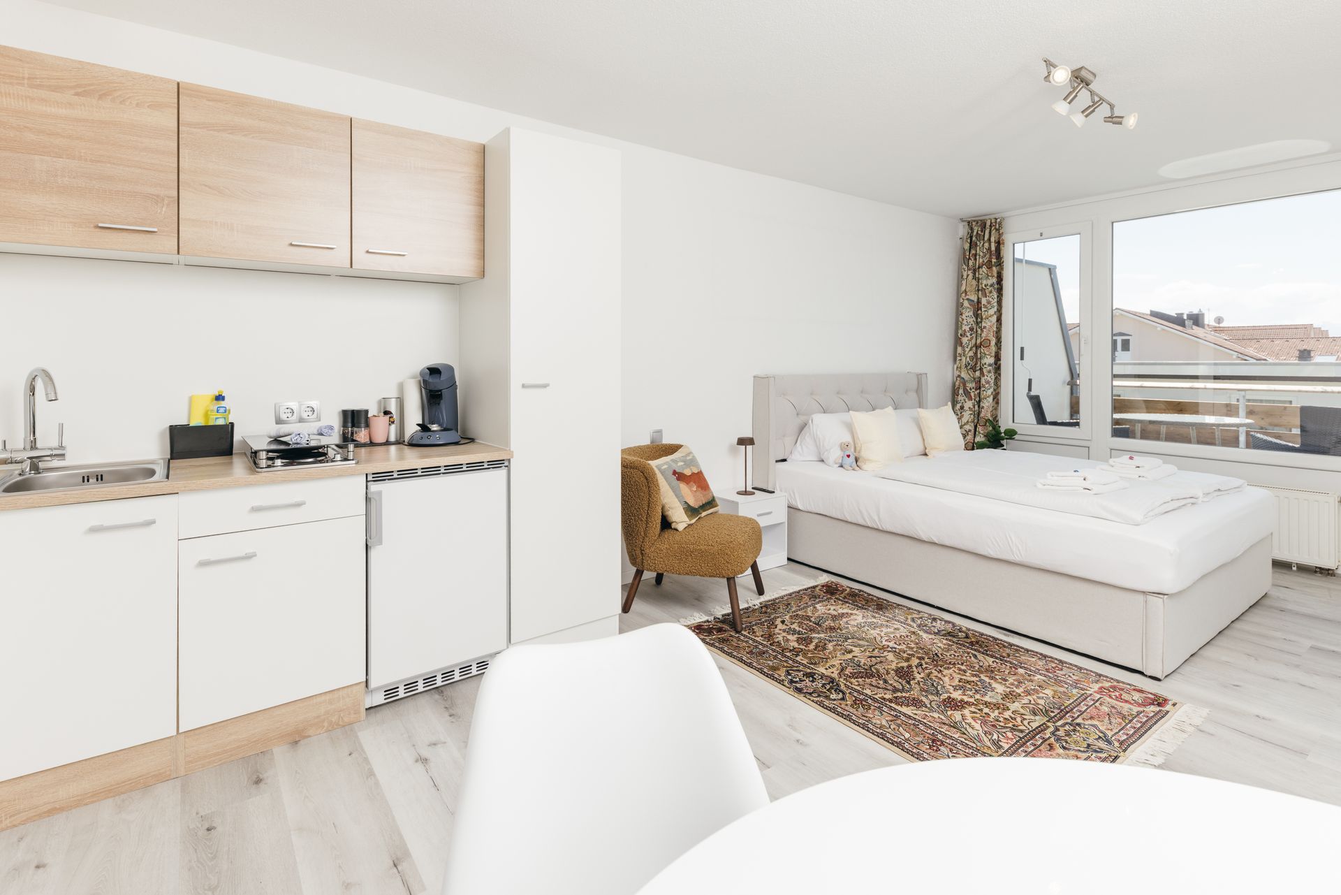 ⚙️ Geräte: Kühlschrank, Tiefkühler, Herd, Mikrowelle, Pad-Kaffeemaschine (Filteraufsatz), Wasserkocher, Toaster, Föhn, Wäscheständer❌ kein Geschirrspüler, ❌ kein Ofen
