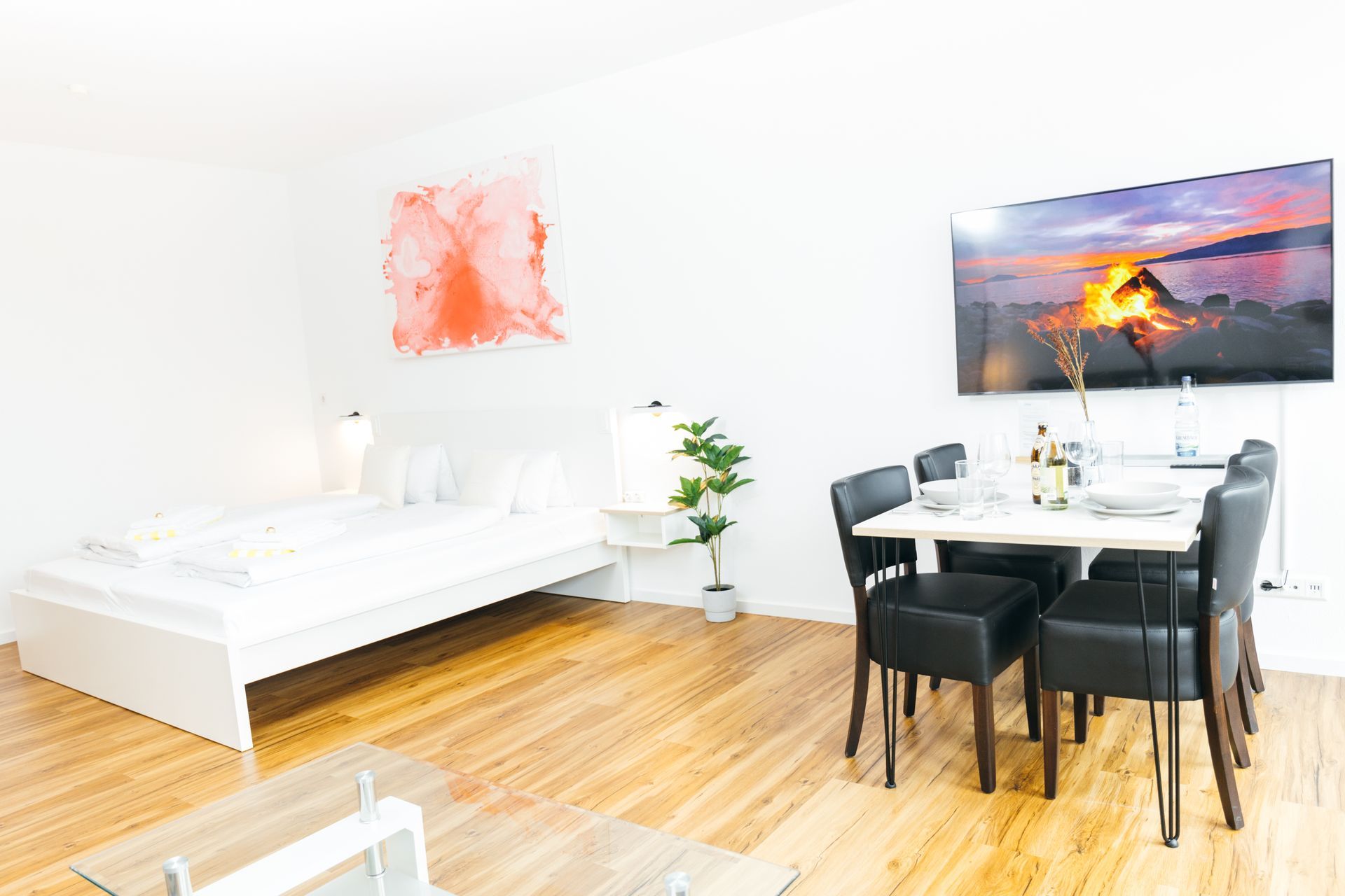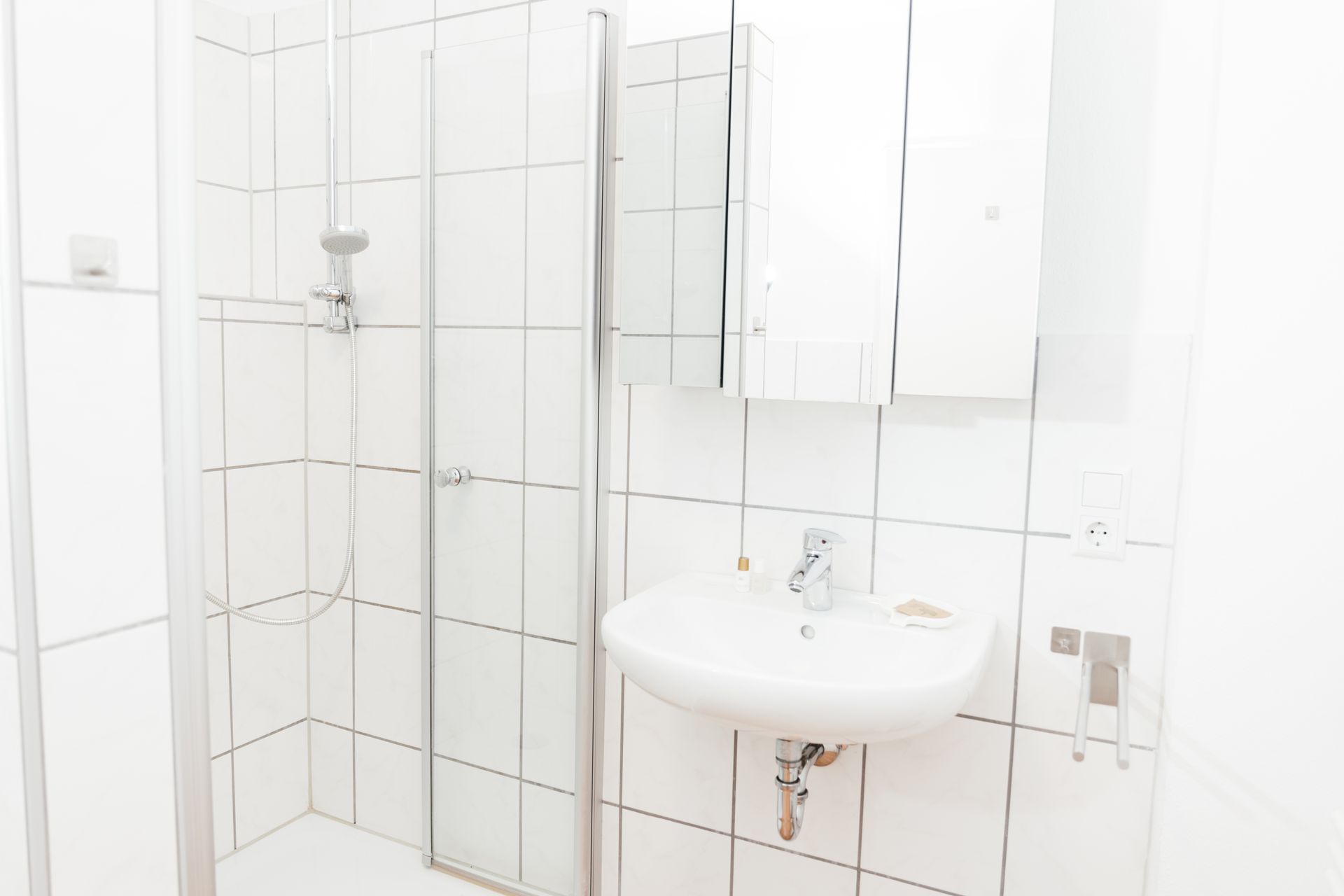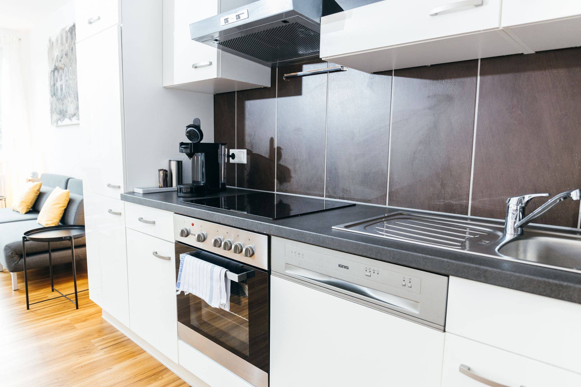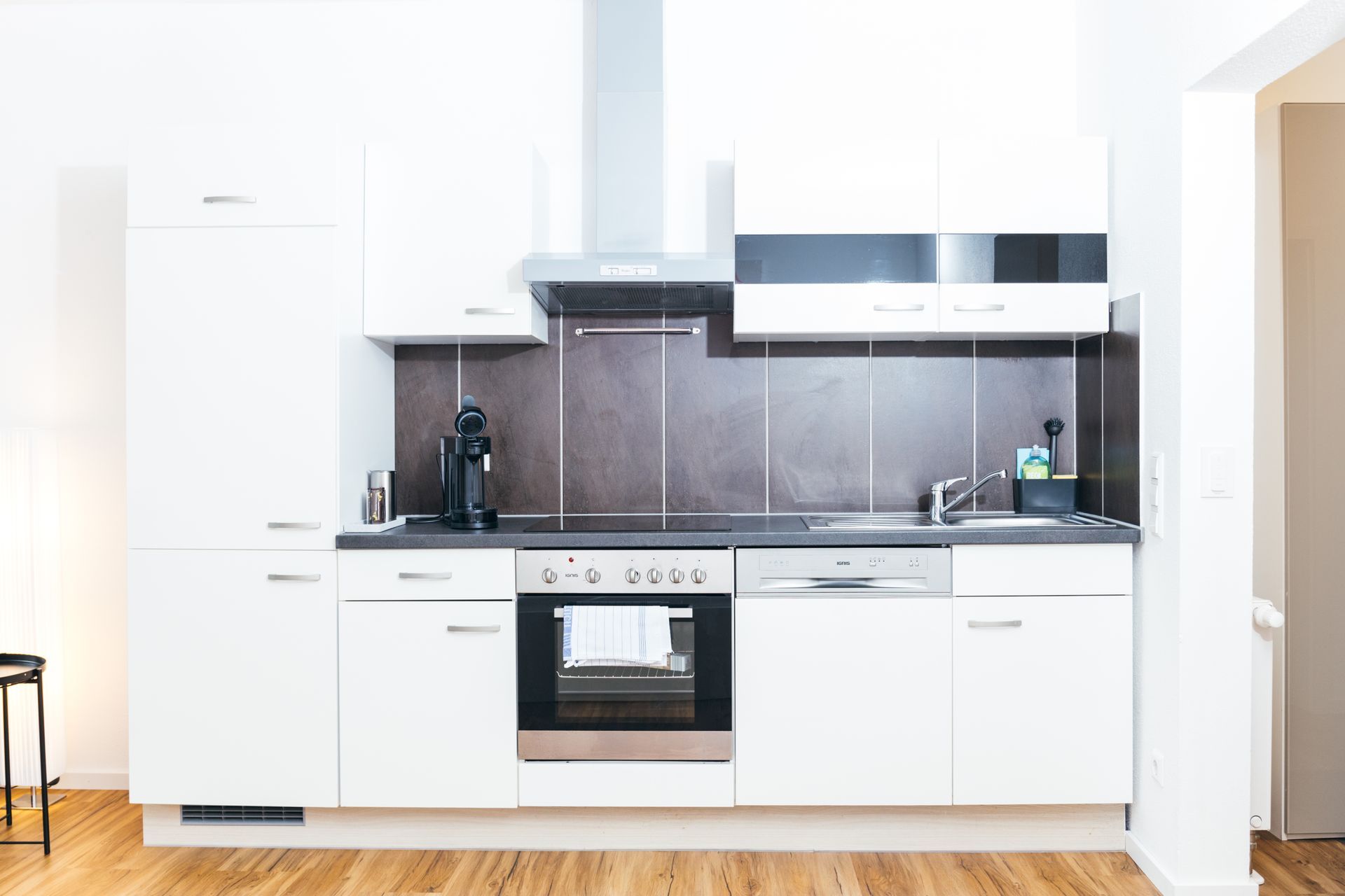 ⚙️ Geräte: Kühlschrank, Tiefkühler, Herd, Mikrowelle, Pad-Kaffeemaschine (Filteraufsatz), Wasserkocher, Toaster, Föhn, Wäscheständer