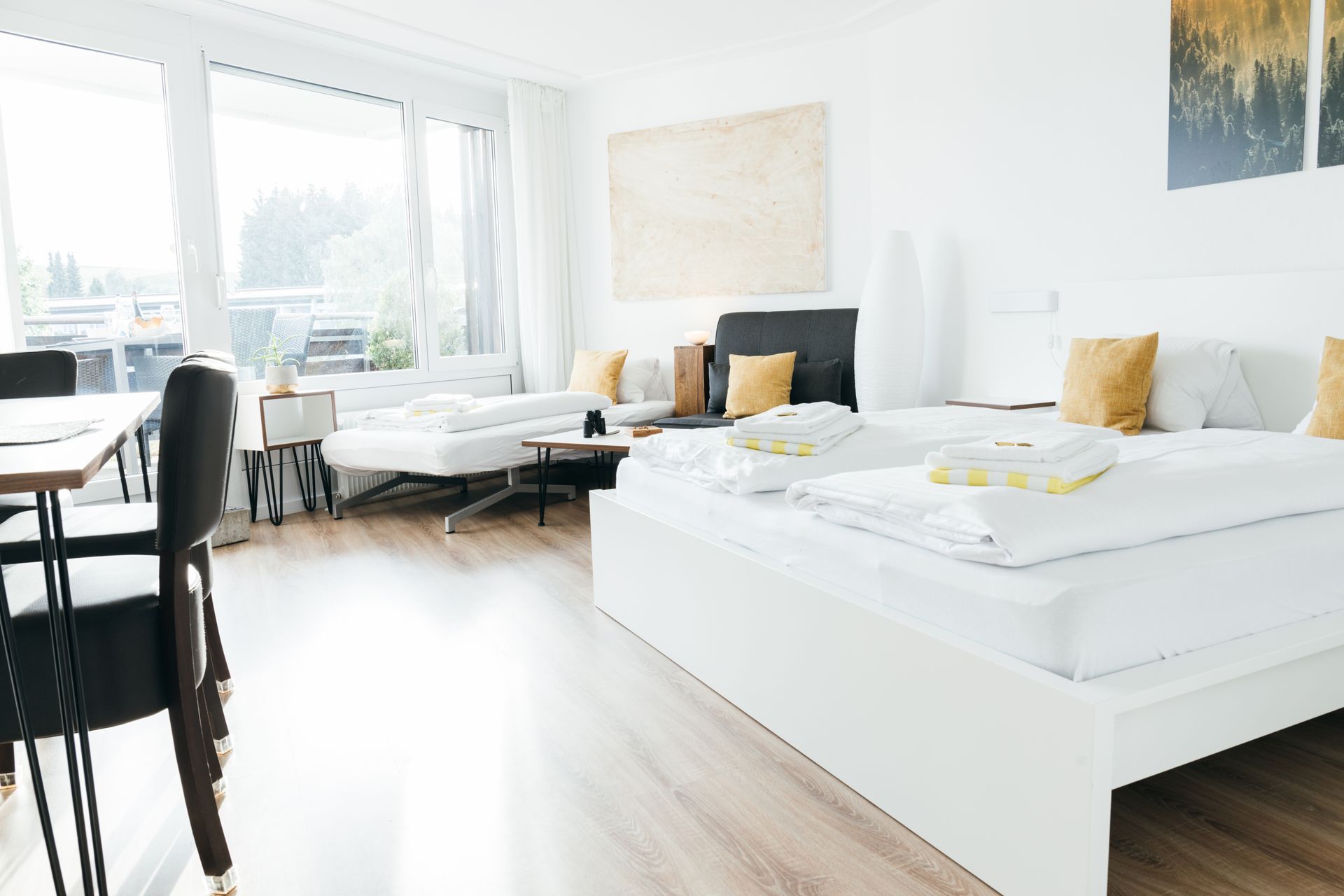 Studio 6 (1 Zimmer, 38 qm) ist ideal für Paare oder Alleinreisende. Der moderne Wohn-Schlafraum ist mit einem bequemen Doppelbett und zwei Sesseln ausgestattet, die zu Betten umgebaut werden können. Der gut geschnittene Balkon mit freiem Blick auf den Höhenweg lädt dazu ein, Sonne und Bergluft zu genießen.