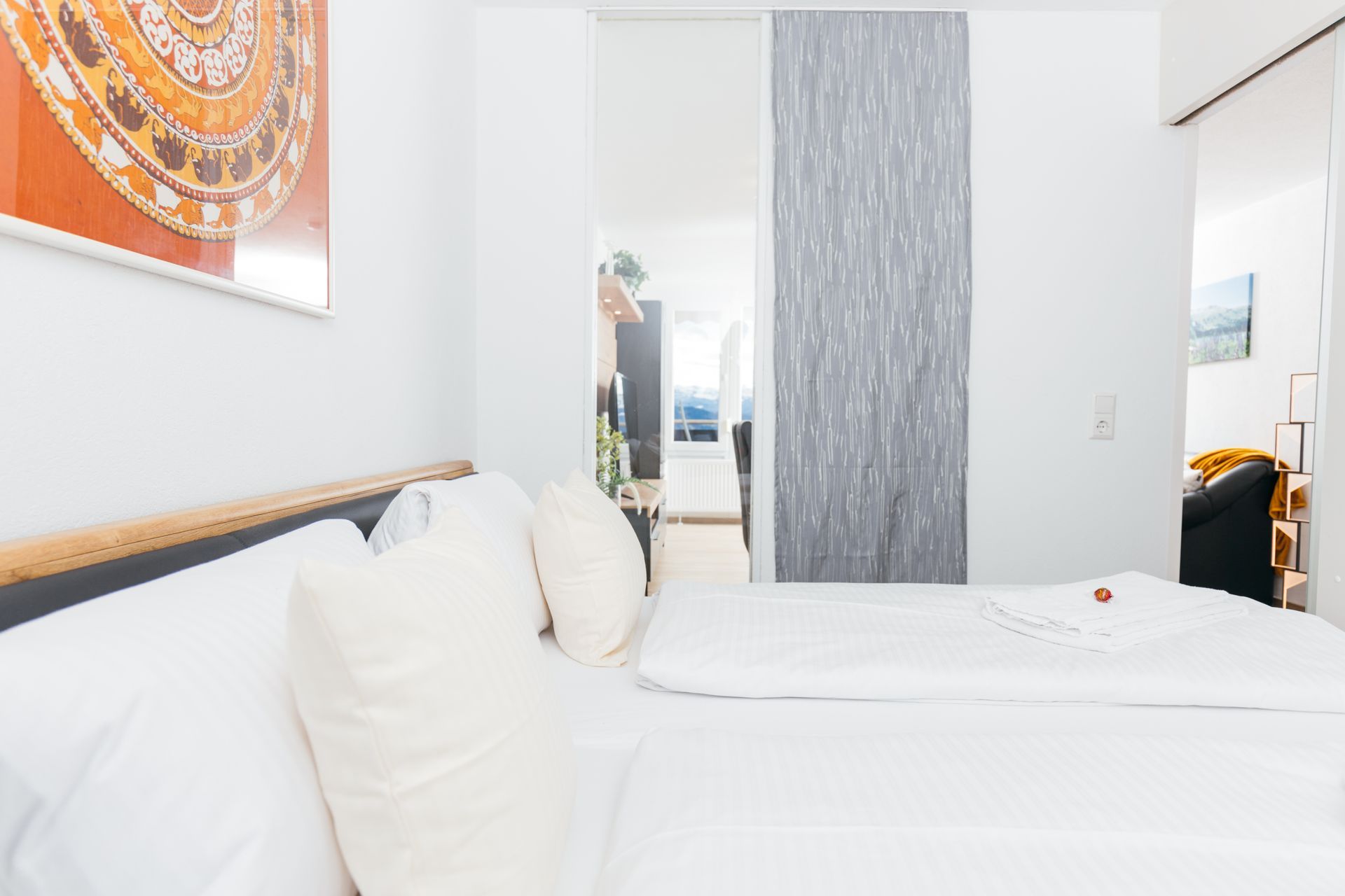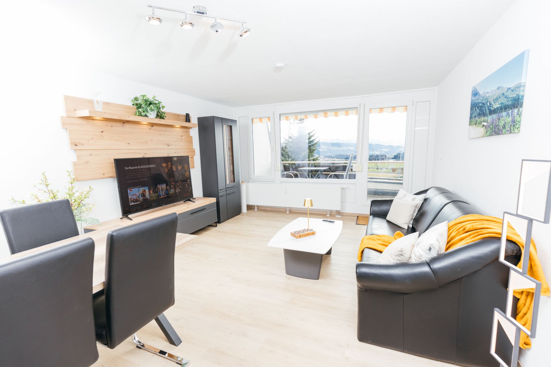 Das Appartement 65 "Allgäu Glück" verfügt über ein durchdachtes, innenliegendes Schlafzimmer mit einem bequemen Doppelbett, von dem aus man durch ein Fenster im Wohnraum einen Blick auf die Berge hat. Im Wohnzimmer befindet sich eine bequeme Schlafcouch für zwei weitere Personen (140x200cm). Der Balkon bietet nicht nur einen wunderschönen Ausblick auf die umliegende Landschaft, sondern ist auch ein idealer Ort zum Entspannen und Abschalten.