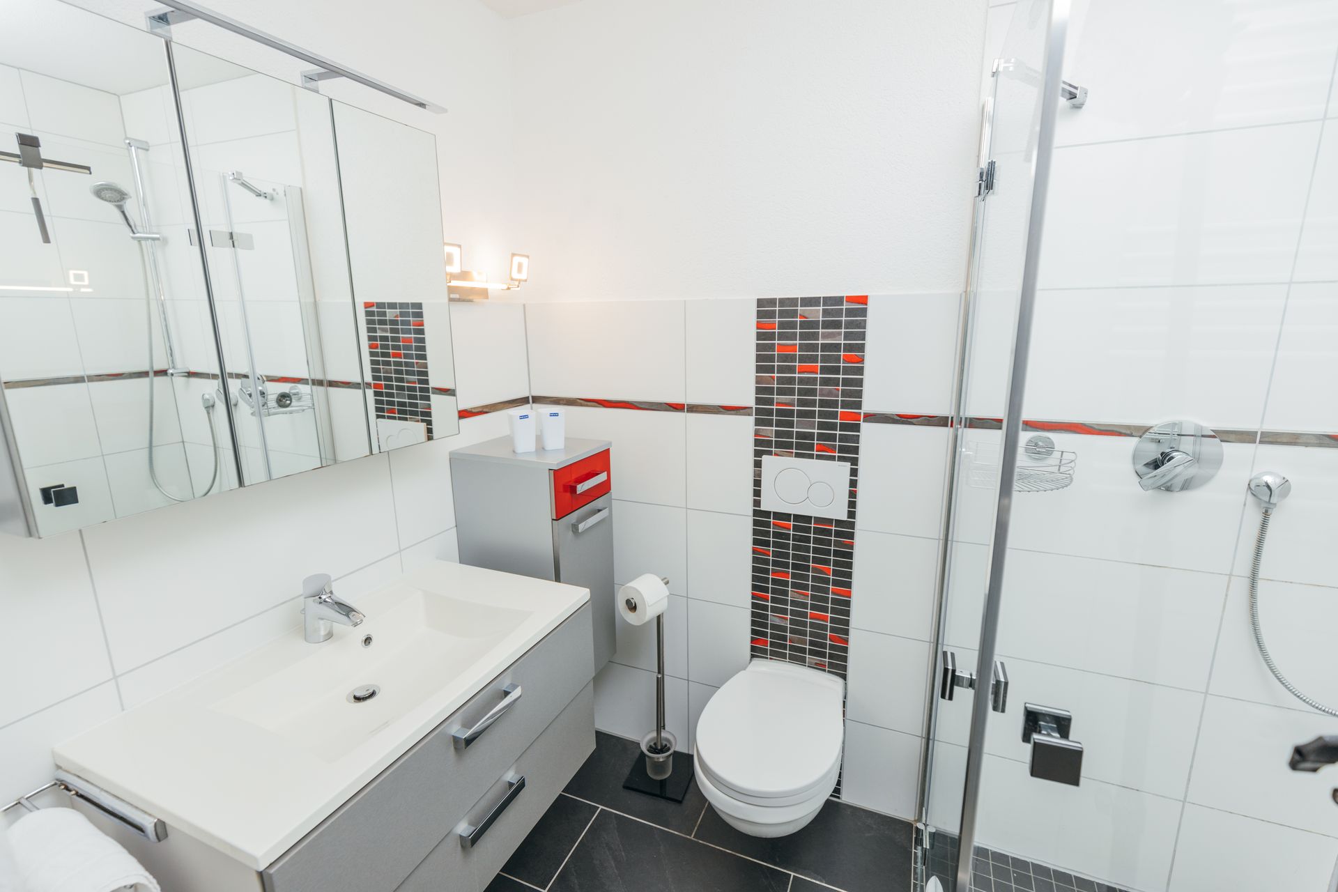 ⚙️ Geräte: Kühlschrank, Tiefkühler, Herd, Mikrowelle, Pad-Kaffeemaschine (Filteraufsatz), Wasserkocher, Toaster, Föhn, Wäscheständer