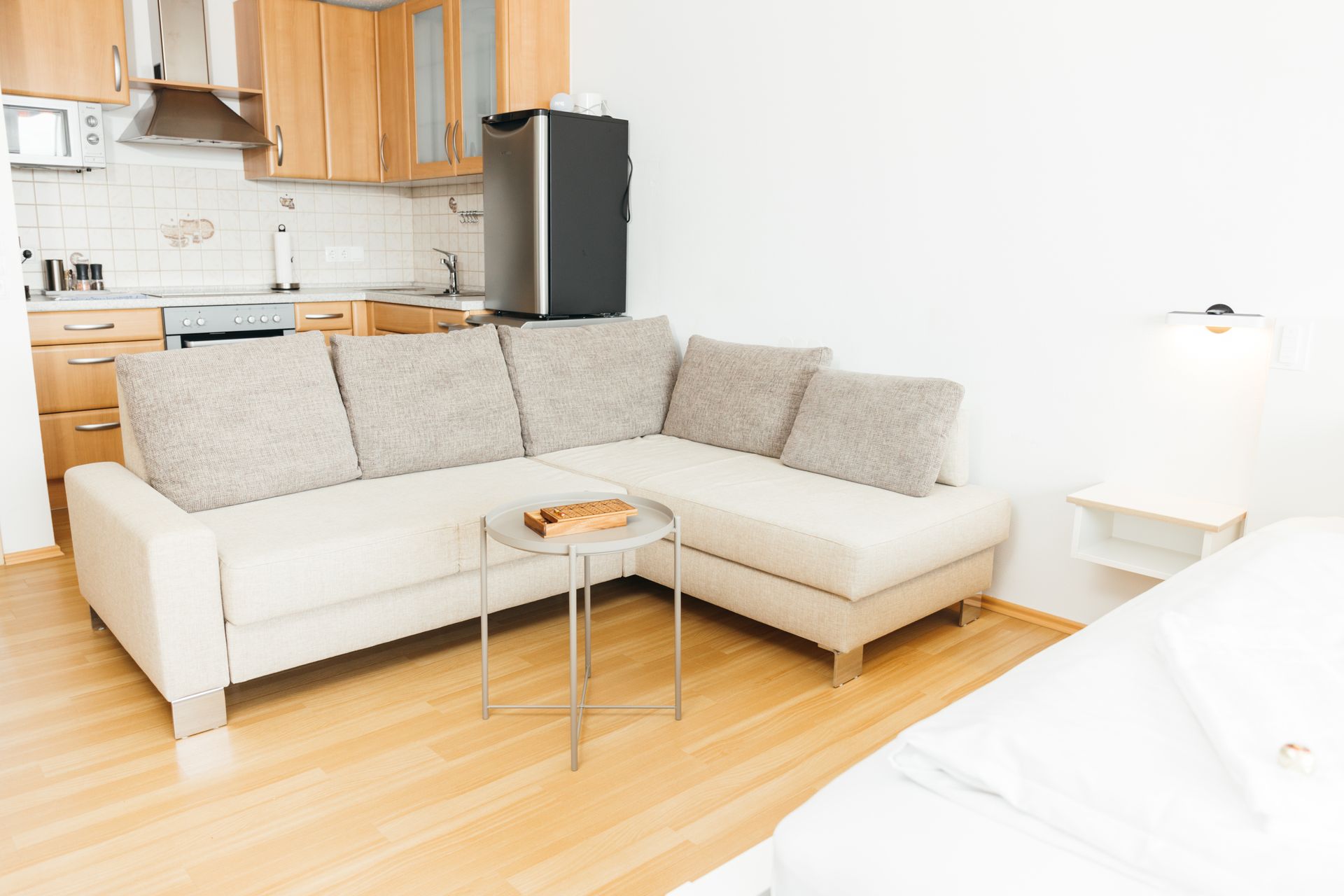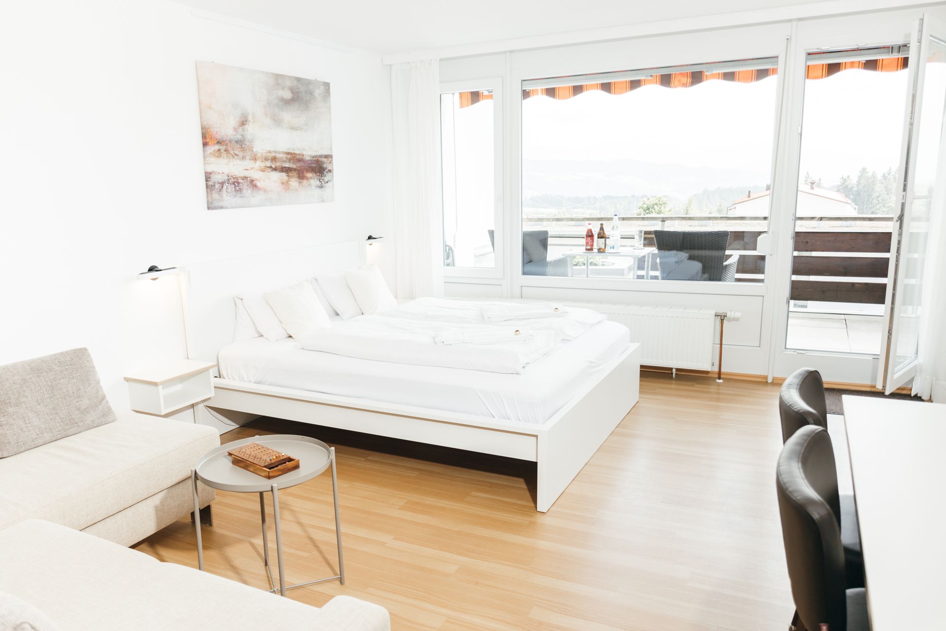 Das Studio 83 verfügt über einen Balkon mit herrlichem Blick auf die Alpen. Die Küche ist hochwertig eingerichtet. Die Einrichtung ist modern. Das Doppelbett ist 160 cm breit. Bei Belegung mit 3 oder 4 Personen wird das Schlafsofa (160x200) als Bett hergerichtet. Das Badezimmer ist mit einer Dusche ausgestattet.