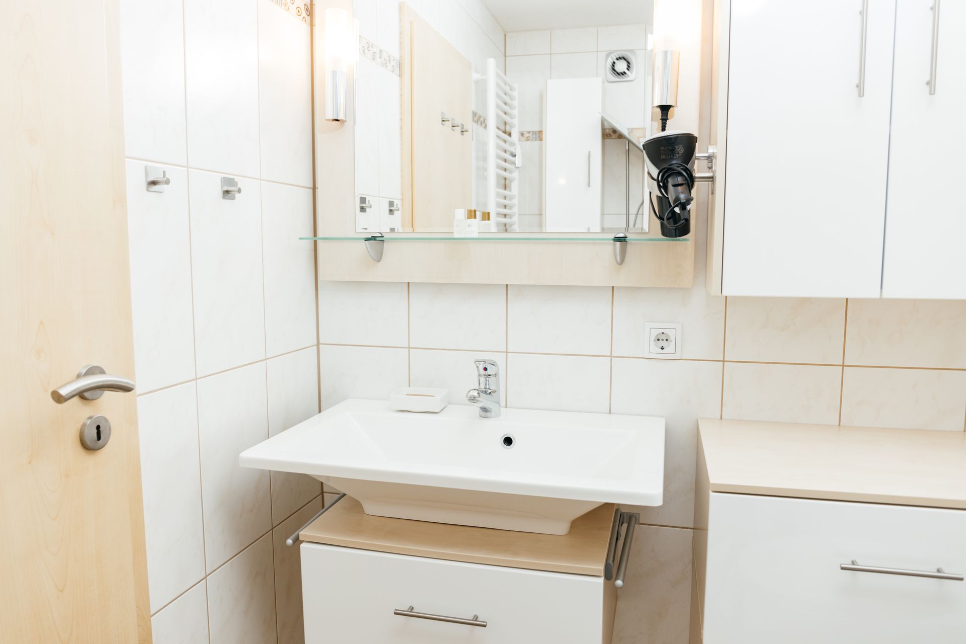 ⚙️ Geräte: Kühlschrank, Tiefkühler, Herd, Mikrowelle, Pad-Kaffeemaschine (Filteraufsatz), Wasserkocher, Toaster, Föhn, Wäscheständer