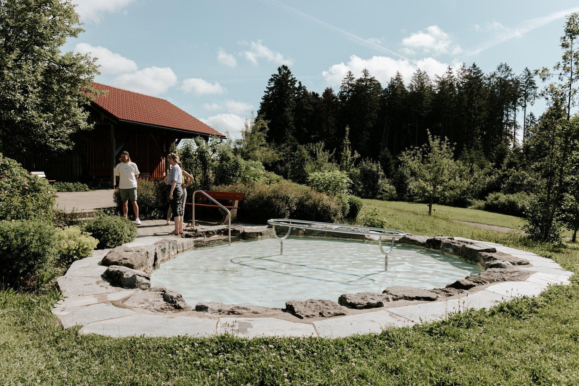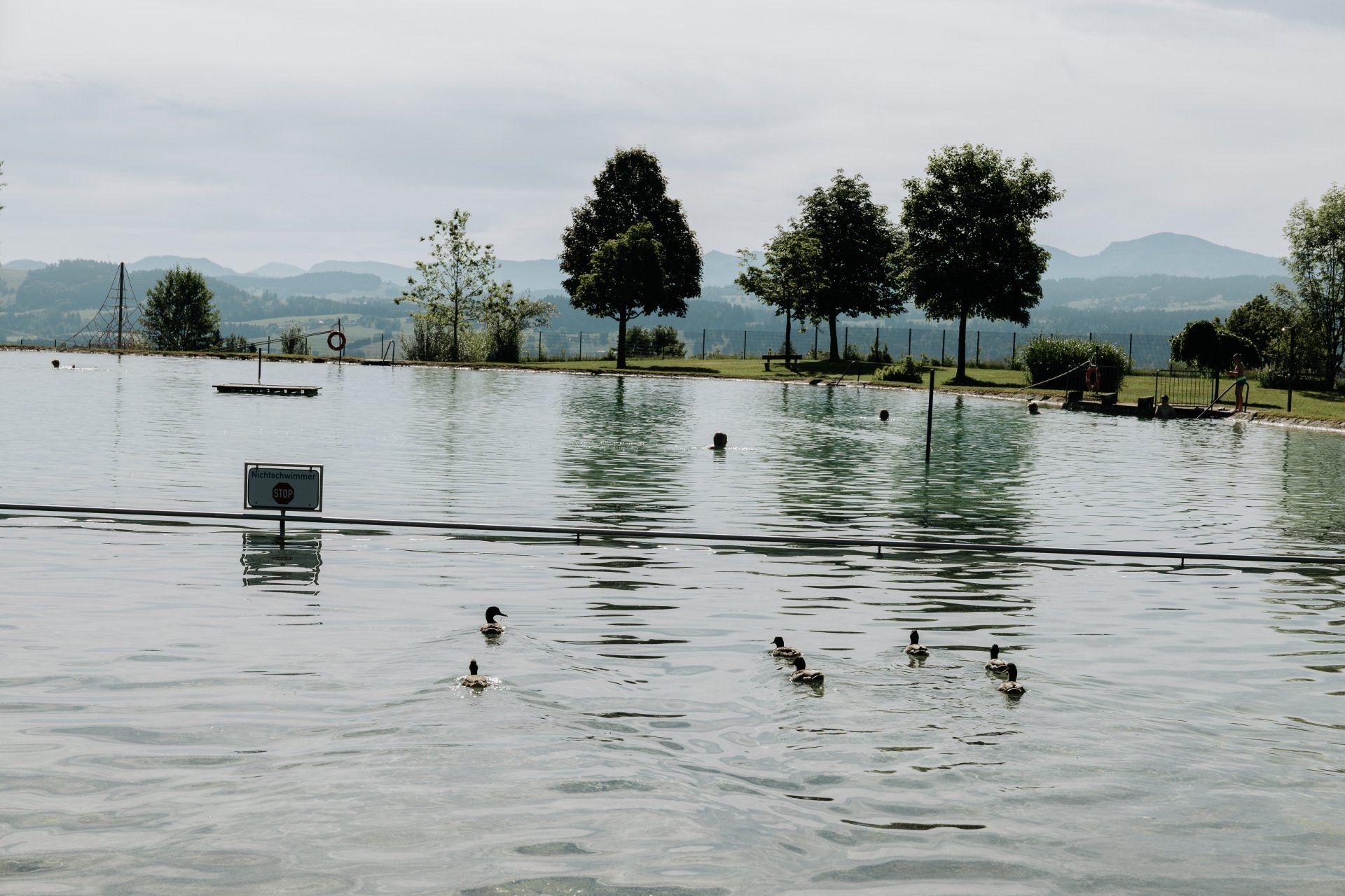 Schwimmen Sie im von Quellwasser gespeisten Naturbecken und genießen Sie von der großzügigen Liegewiese aus das eindrucksvolle Alpenpanorama im Dreiländereck – ein Anblick, der inspiriert und entspannt zugleich.